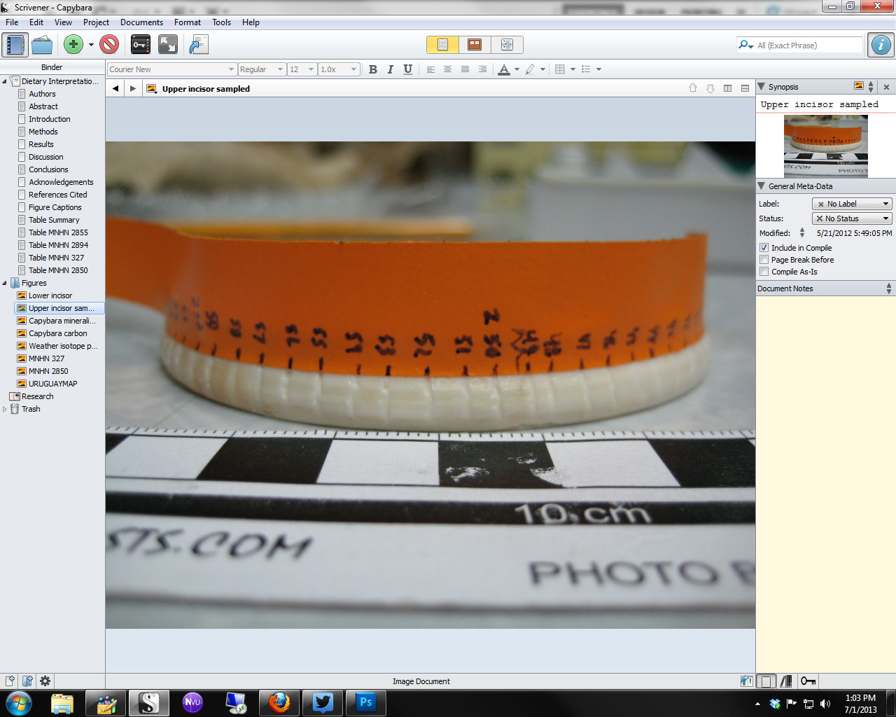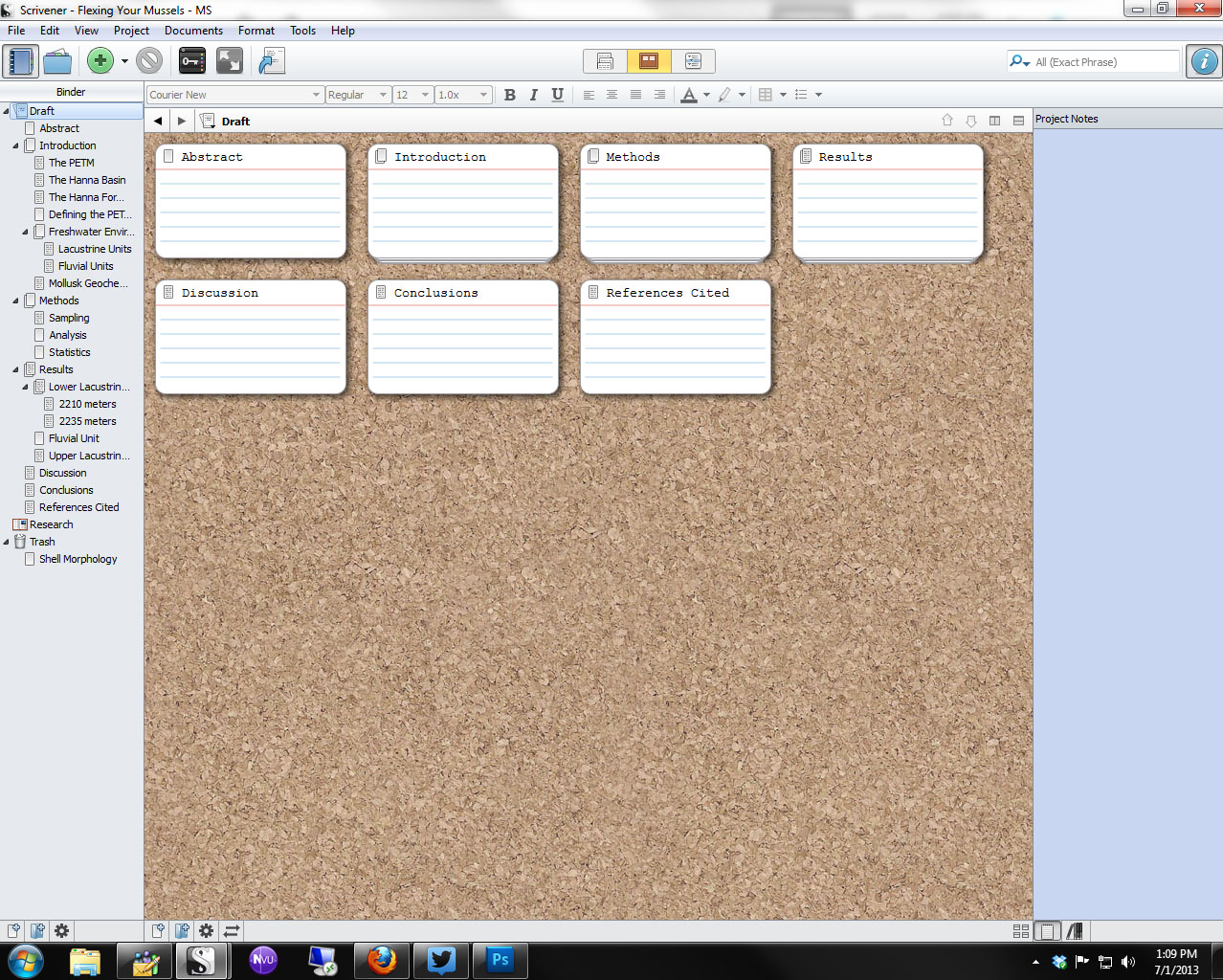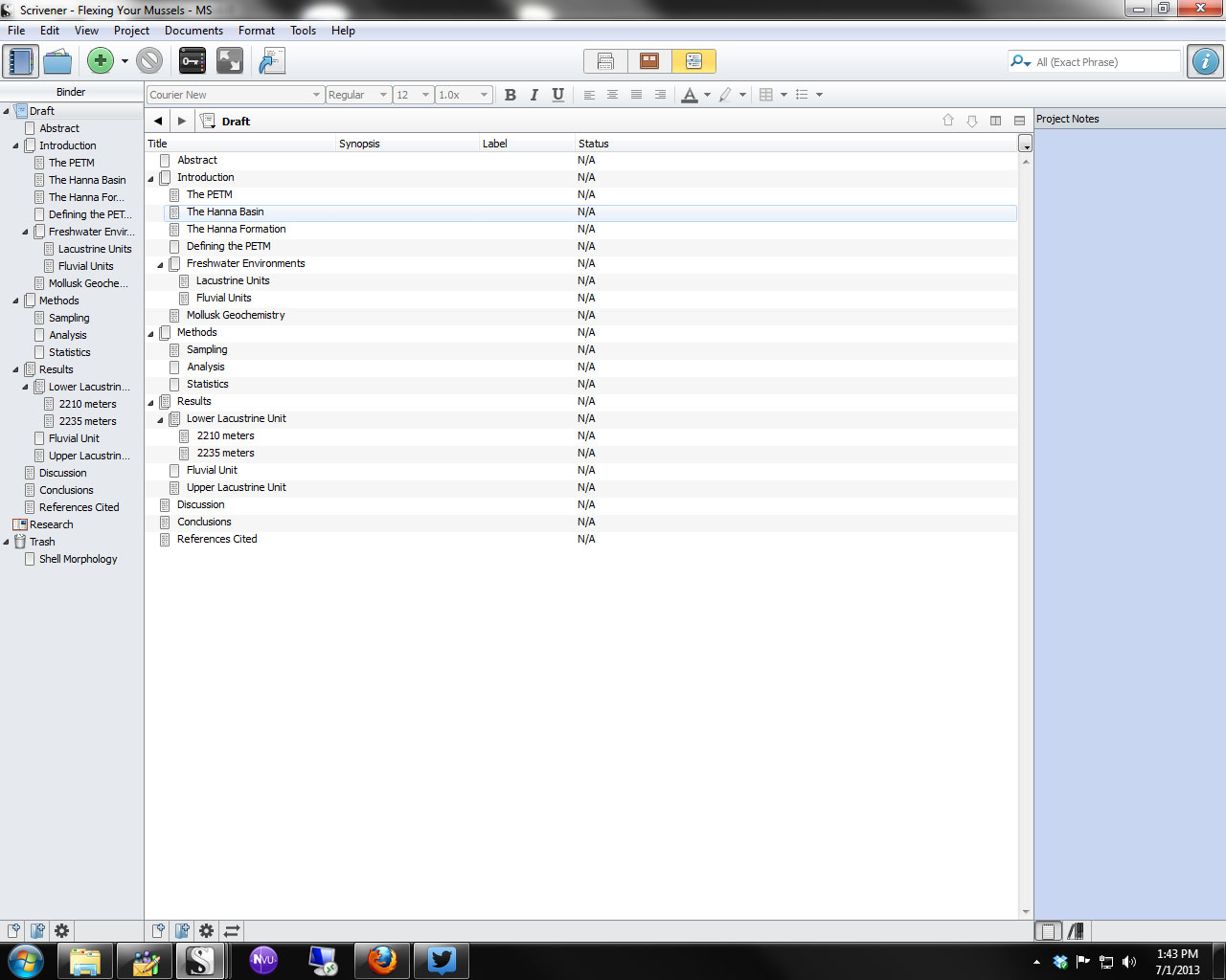 This is the ‘cork board’ view. Each section (document) is its own index card. I can drag and drop them in whatever order I want. Since this is a professional manuscript, you’ll notice that tables each have their own file, as well as the references cited and figure captions. The figures themselves could also have their own cards, but knowing that I’d have to upload the images to the journal website separately, I haven’t bothered.