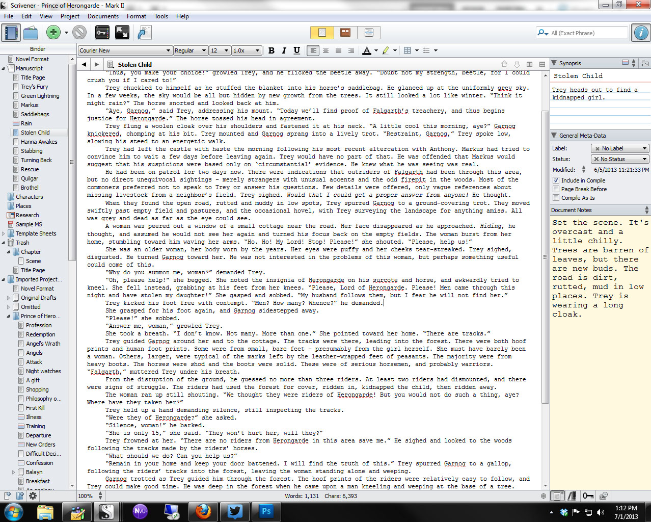 There’s this writing software out there called Scrivener. I was introduced to Scrivener after winning my first NaNoWriMo in November of 2011. Primarily, Scrivener is marketed toward writers of fiction, or of books, but it has application well beyond that. I can tell you that I use it for almost all of my writing, if what I’m working on is more than 1,000 words long.