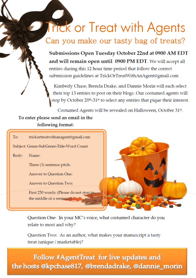 In October there comes a contest called ‘Trick or Treat with Agents,’ which is hosted by Kimberly Chase, Brenda Drake, and Dannie Morin.