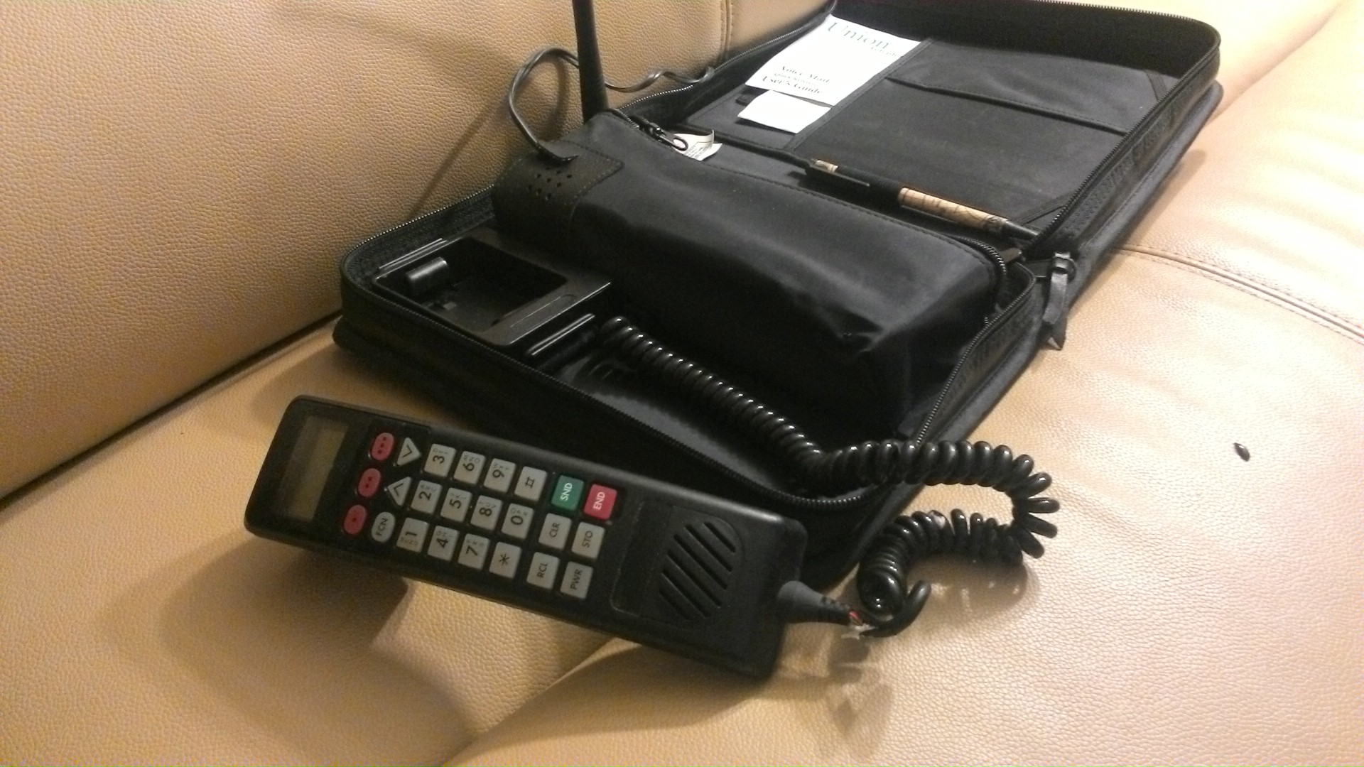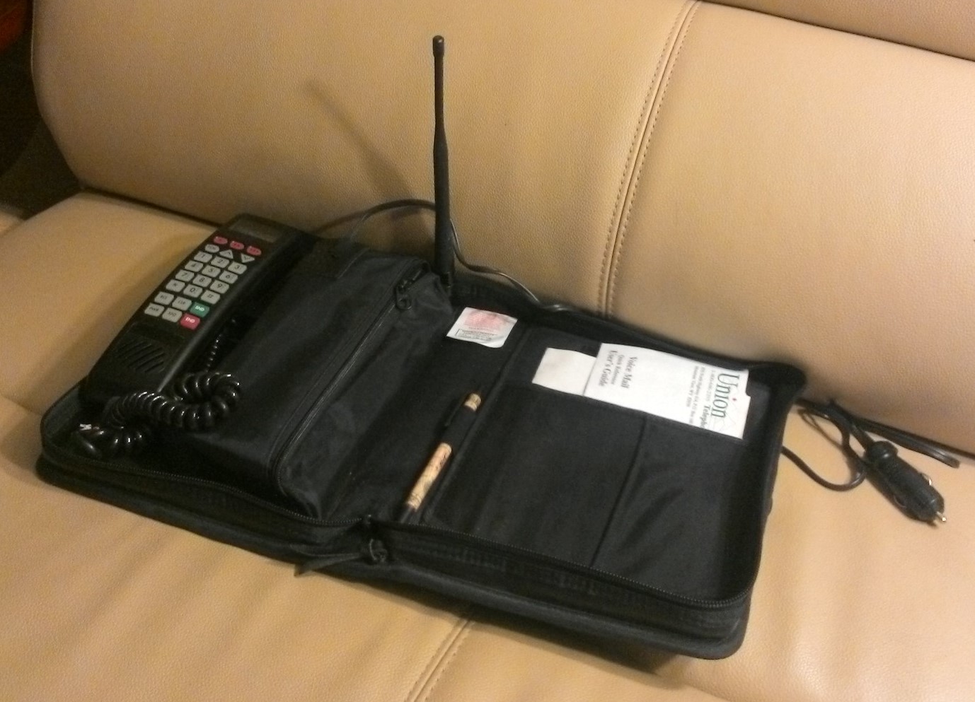 This is what cellular telephones were when they finally became ‘portable.’ There’s the antenna and the charger, and the massive battery pack.