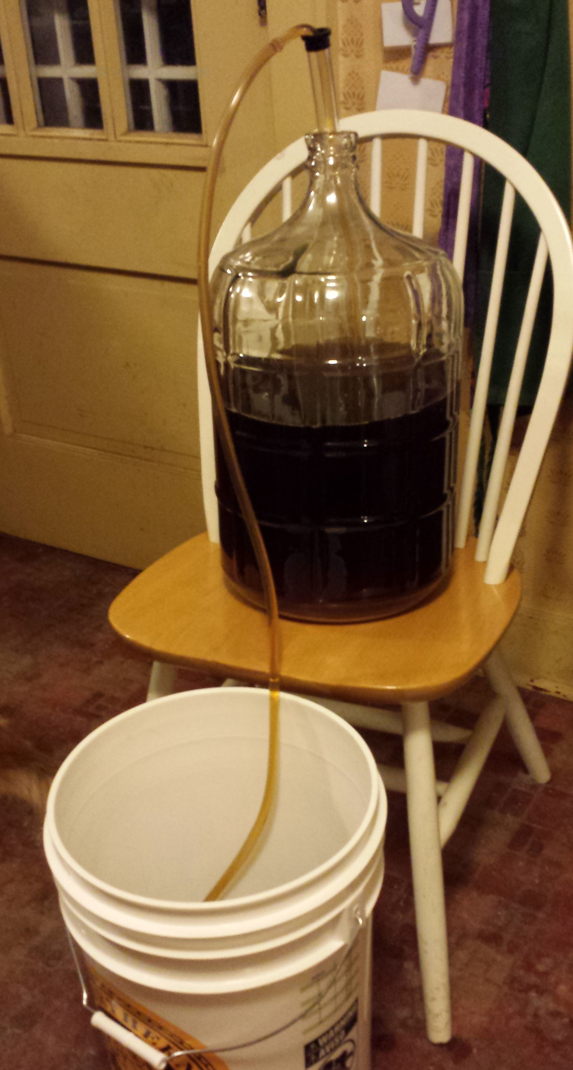Then, the beer gets siphoned out of the glass carboy into a bucket for filling. The sugar-water mixture is already at the bottom of the bucket.