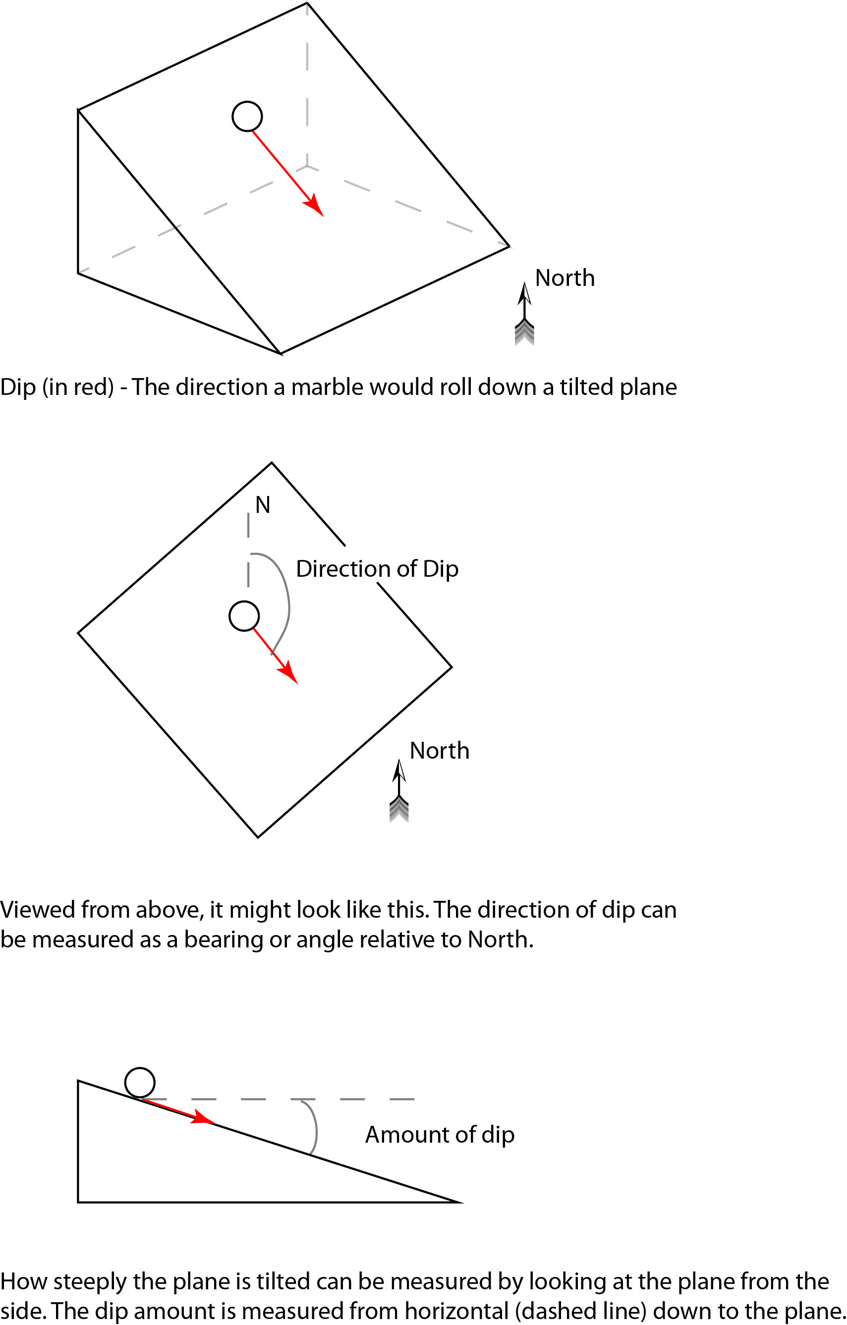 What’s very important is knowing the angle at which the beds tilt away from perfectly horizontal. This is called Dip. Then you need to know the dip direction, which is the way a marble would roll if it rolled along the rock surface.
