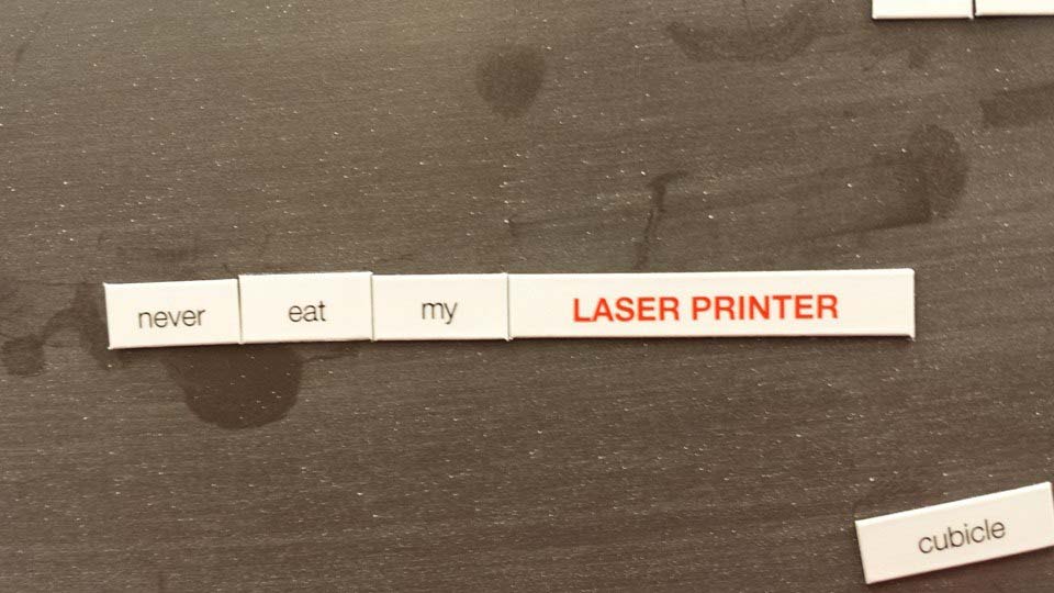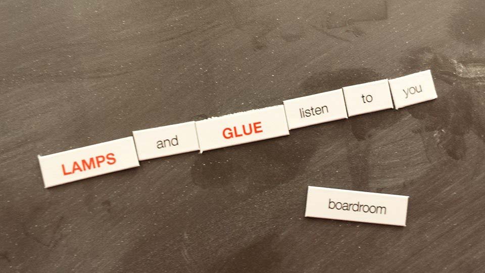 Today, I got my grubby fingers on one of those sets of magnetic words that people use to make creative poetry on their refrigerators. This particular set is from an office products catalog.