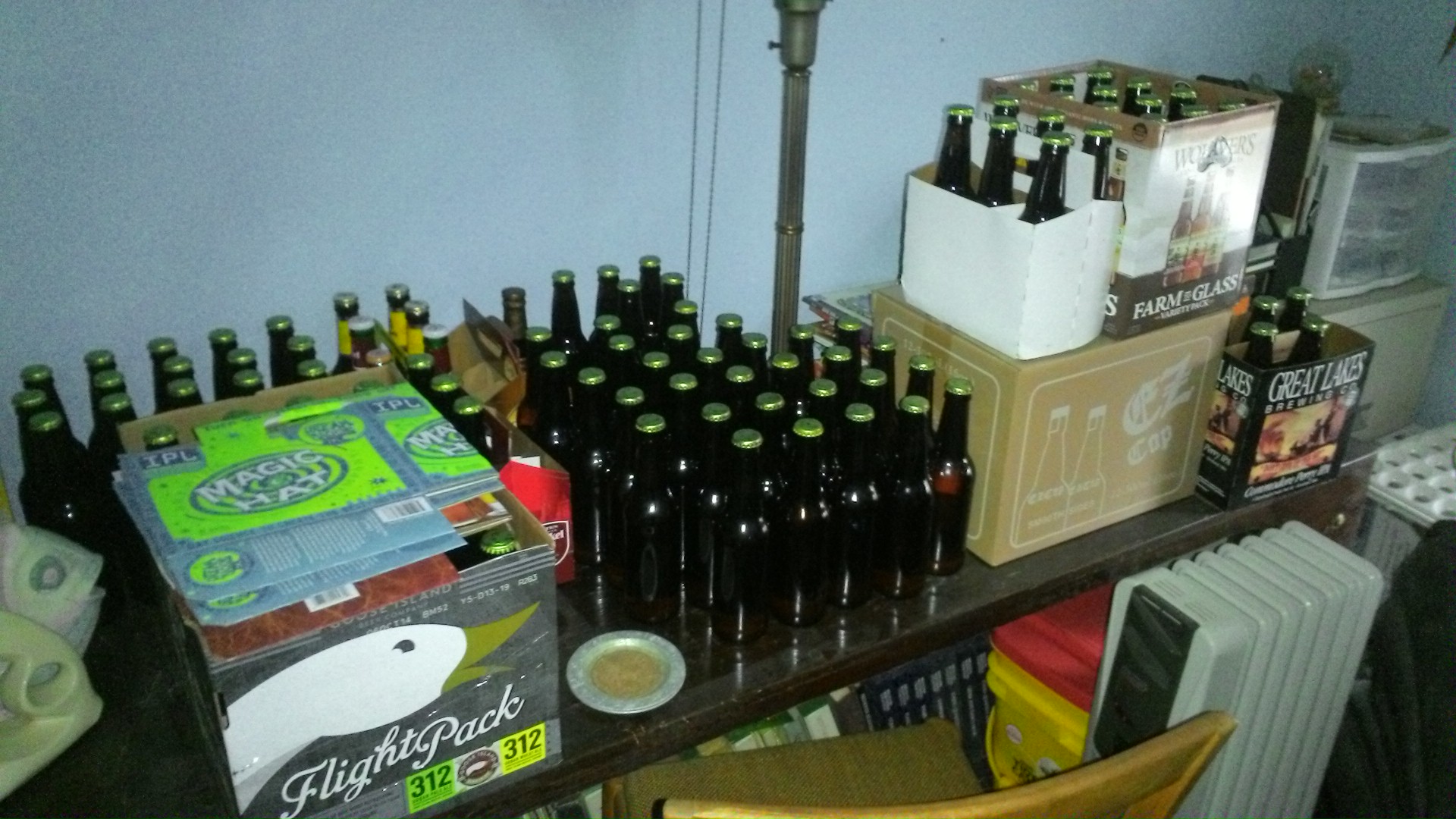 Here’s the pile of bottled brews, conditioning away – in the guest bedroom.