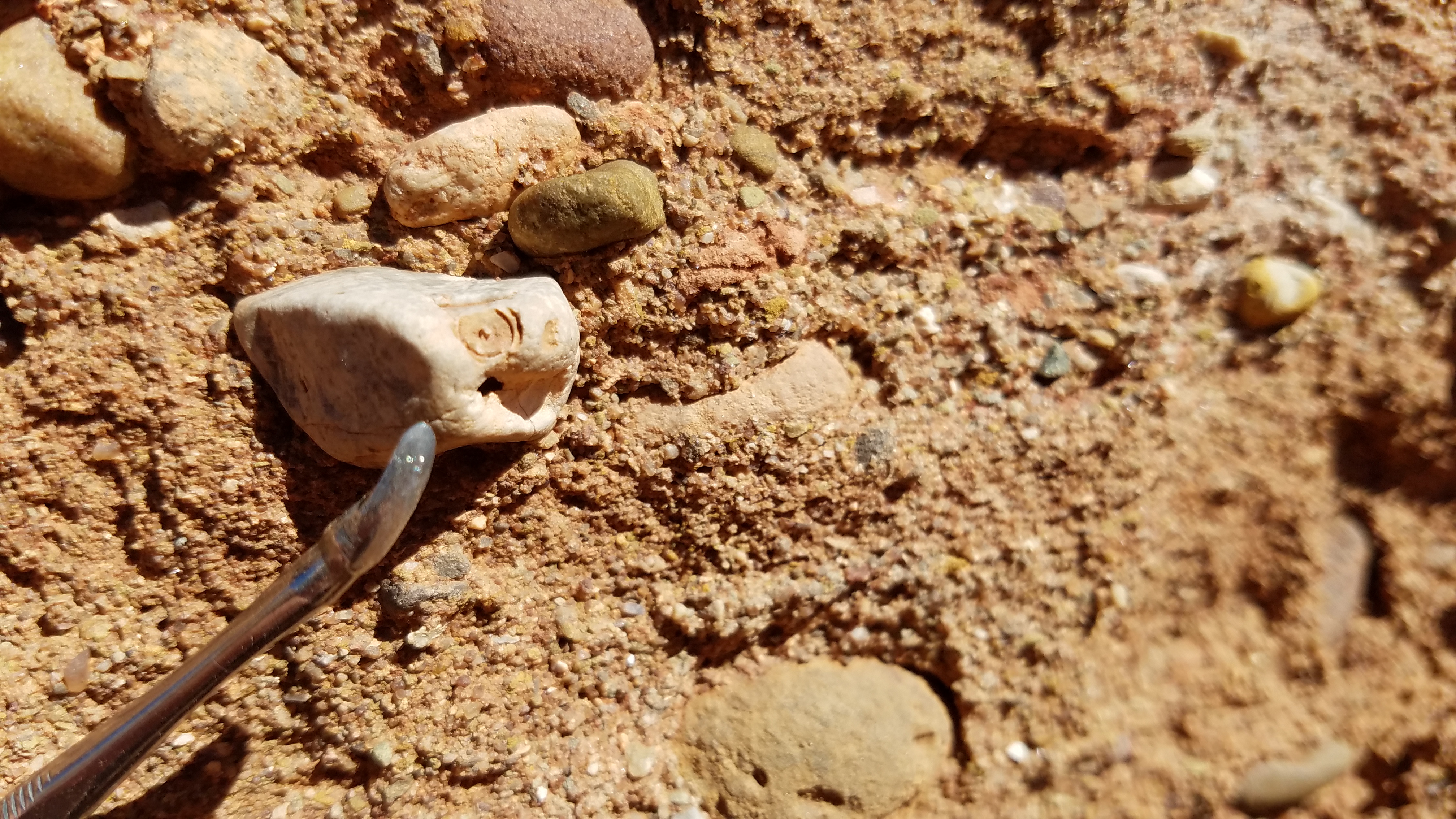 And a cool sea fossil embedded in a conglomerate rock after being transported and deposited by a river.