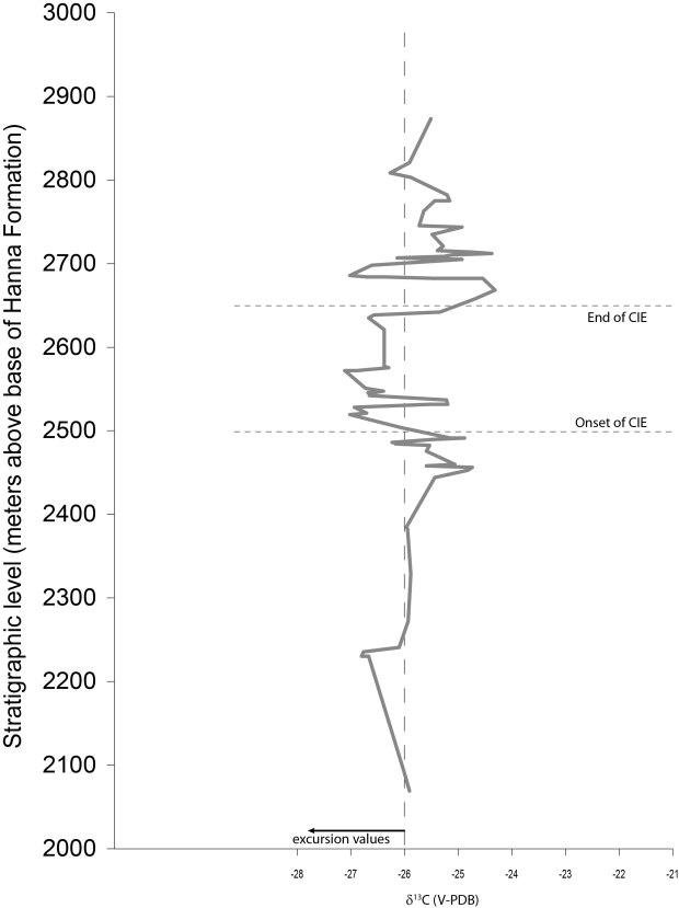 Carbon Isotopes from the Hanna Formation, showing the CIE and the location of the LLU and ULU