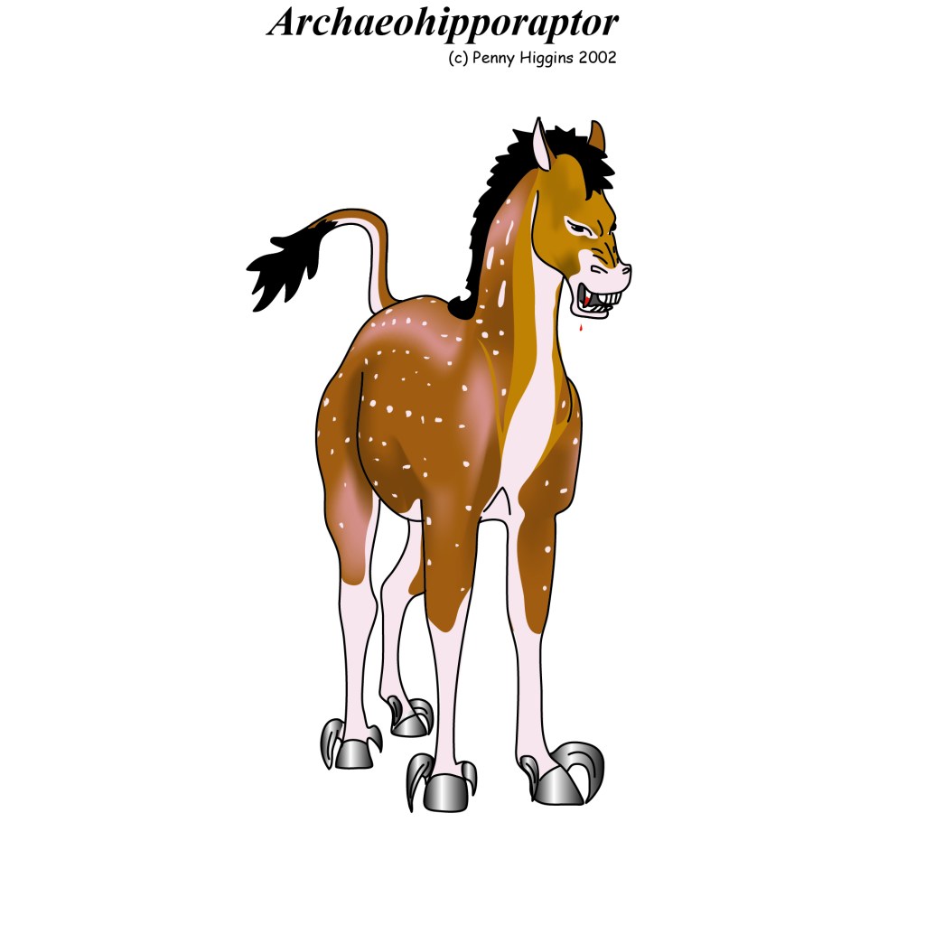 Joke art taking the fossil horse Archaeohippus and adding fangs and long recurved claws. The humor is that this is the only way to get a fossil horse on the cover of Discover Magazine.