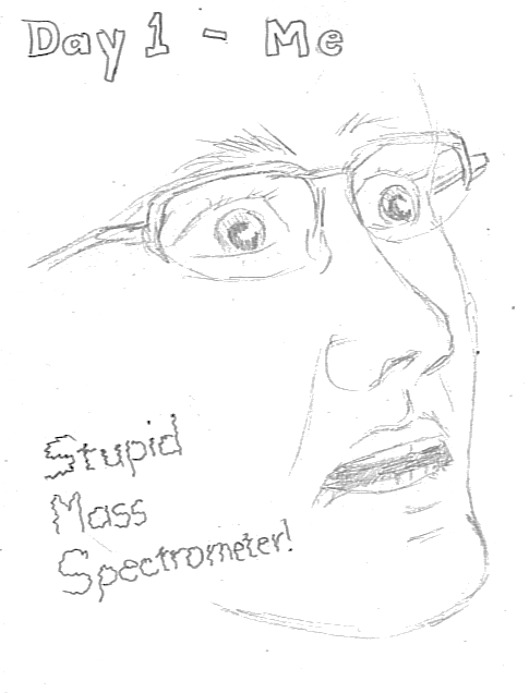 Not the best drawing, to be sure. It’s base on how I perceive myself to look, not on any photograph or viewing myself in the mirror. The mass spectrometer is often my worst enemy.